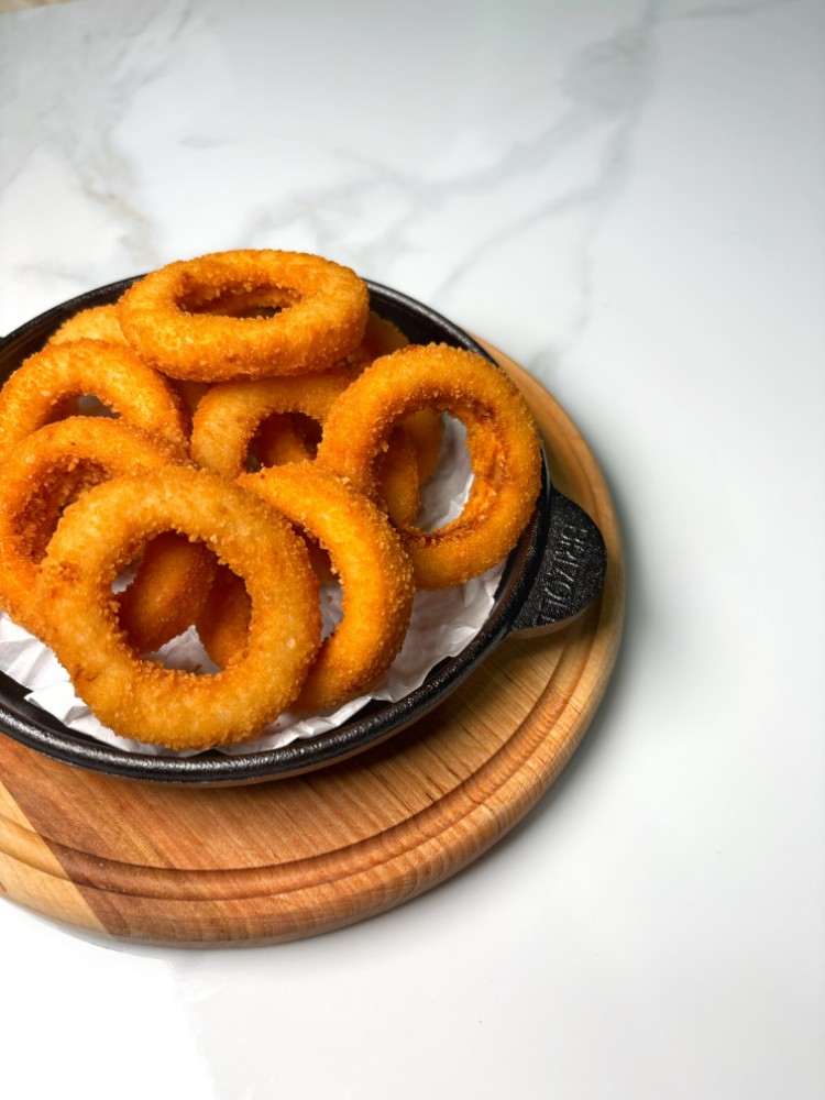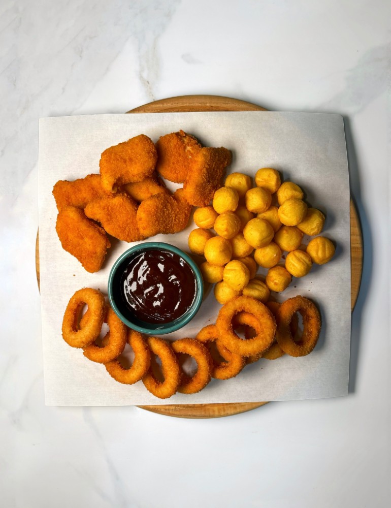 Картопляні кульки, нагетси, цибулеві кільця, соус BBQ.